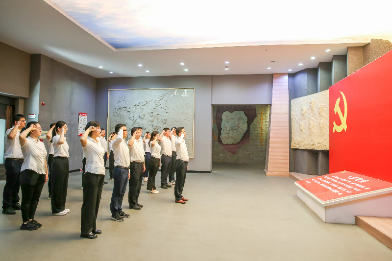 在新四军廉政建设史实馆内,全体党员整齐排列,面向鲜艳的党旗,高举右拳,重温入党誓词,声声誓言,铿锵有力,在大厅中回响,充分展现了全体党员对党的无限忠诚以及为数智科技工作不懈奋斗的坚定决心。