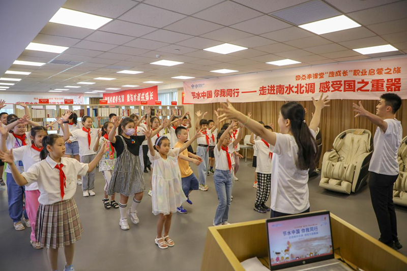 本站活动的主题是“节水中国 你我同行——走进南水北调感受大国重器”,3个主题场馆,10项课堂活动,志愿者们用童言趣语带领青少年了解南水北调工程知识、培养节水护水意识。
