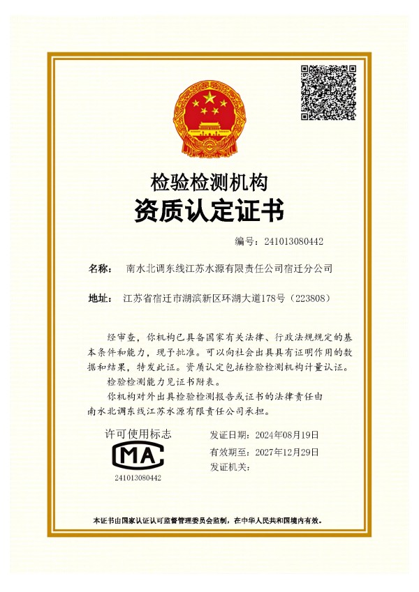 近日,经江苏省检验检测机构资质认定评审组的现场评审和江苏省市场监督管理局的审批,南水北调东线江苏水源有限责任公司水文水质监测中心顺利取得CMA扩项认定证书,至此水文水质监测中心检验检测能力包括地表水、生活污水、工业废水及地下水等32项39个指标。