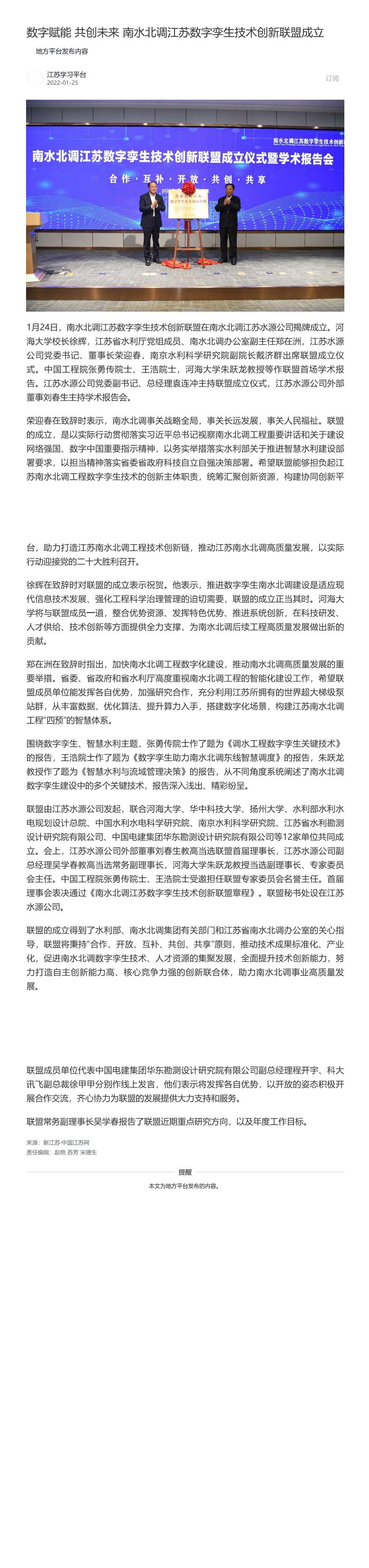 新华网、学习强国、中国江苏网:数字赋能 共创未来——南水北调江苏数字孪生技术创新联盟成立