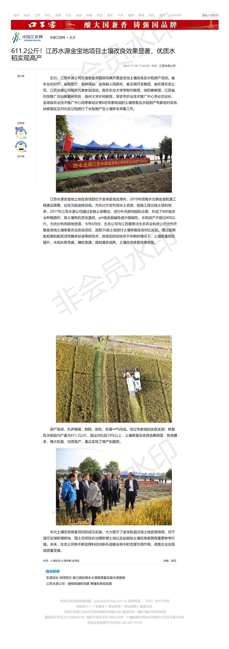 中国江苏网、新江苏网:611.2公斤!江苏水源金宝地项目土壤改良效果显著,优质水稻实现高产