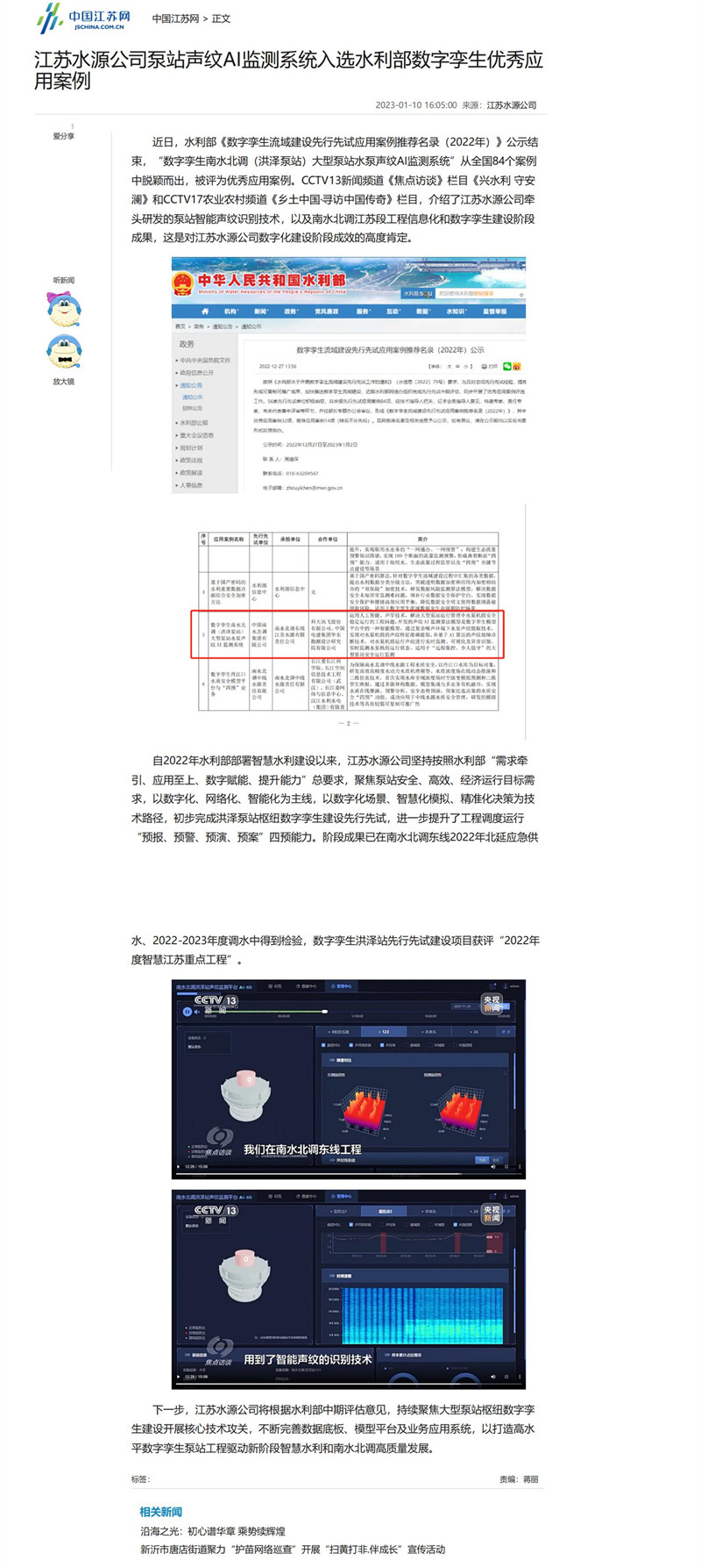学习强国、中国江苏网、新江苏网——黑料 泵站声纹ai监测系统入选水利部数字孪生优秀应用案例