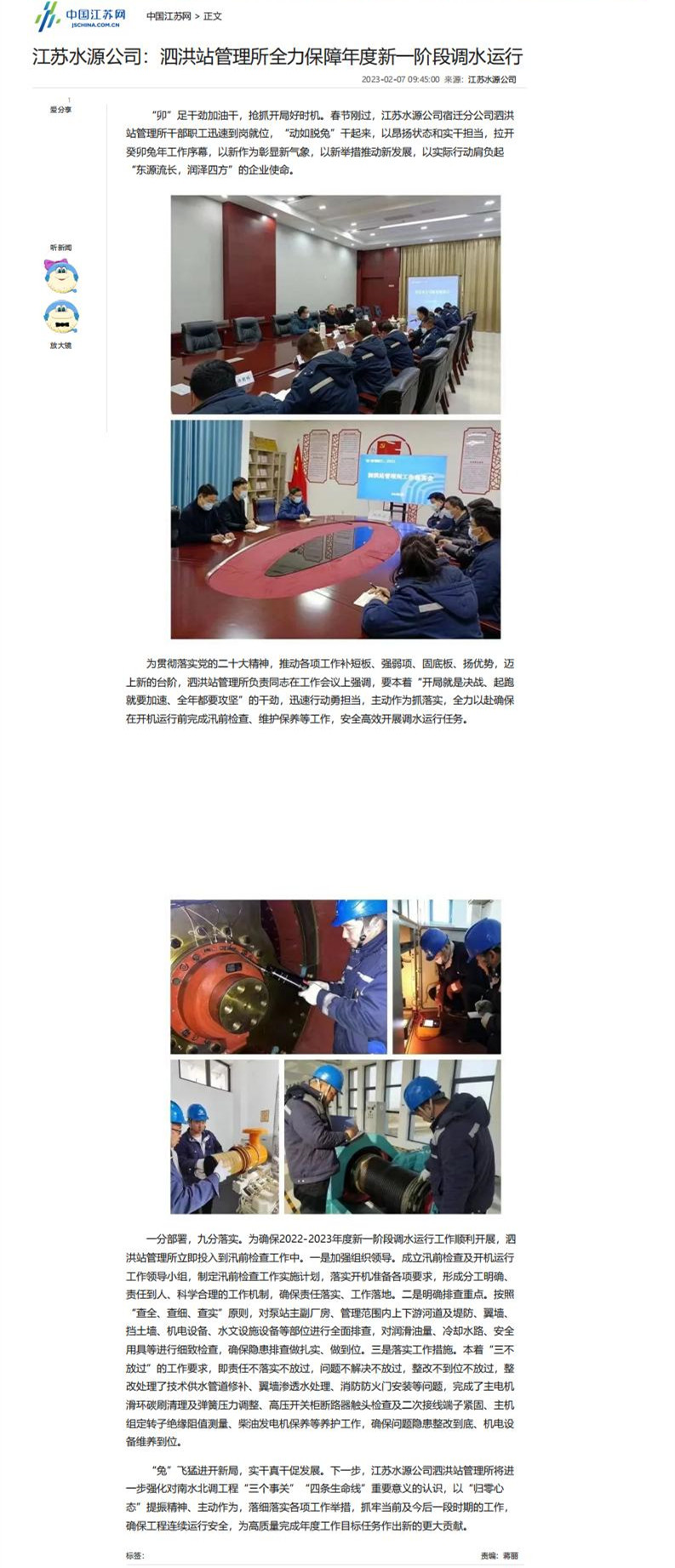 中国江苏网、新江苏网——黑料 :泗洪站管理所全力保障年度新一阶段调水运行