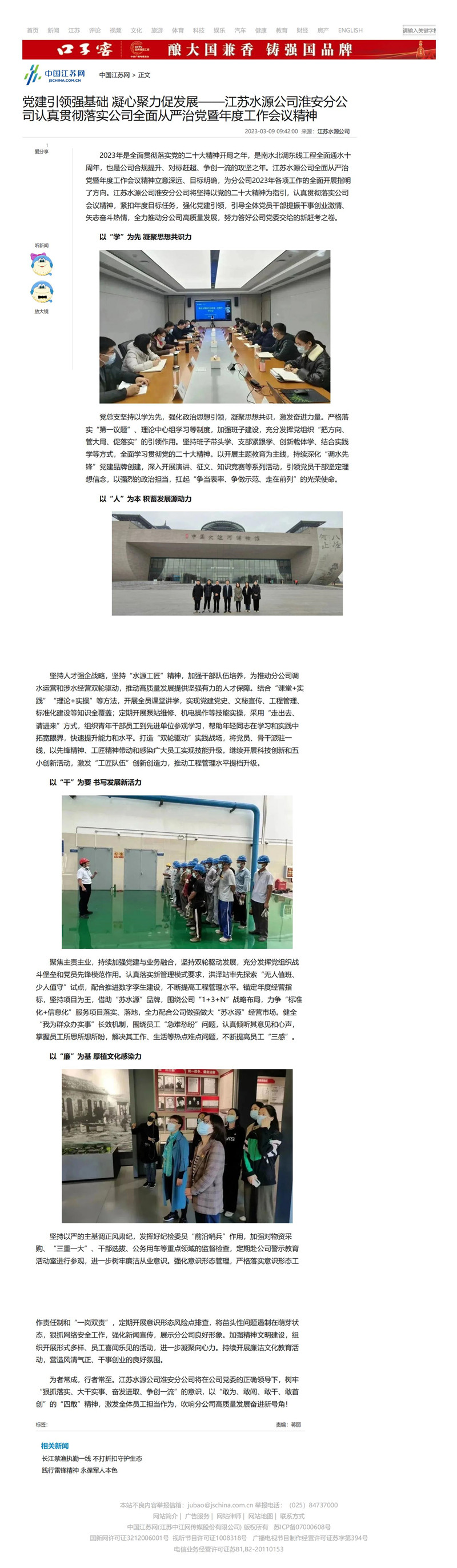 中国江苏网、新江苏网:党建引领强基础 凝心聚力促发展——黑料 淮安分公司认真贯彻落实公司全面从严治党暨年度工作会议精神