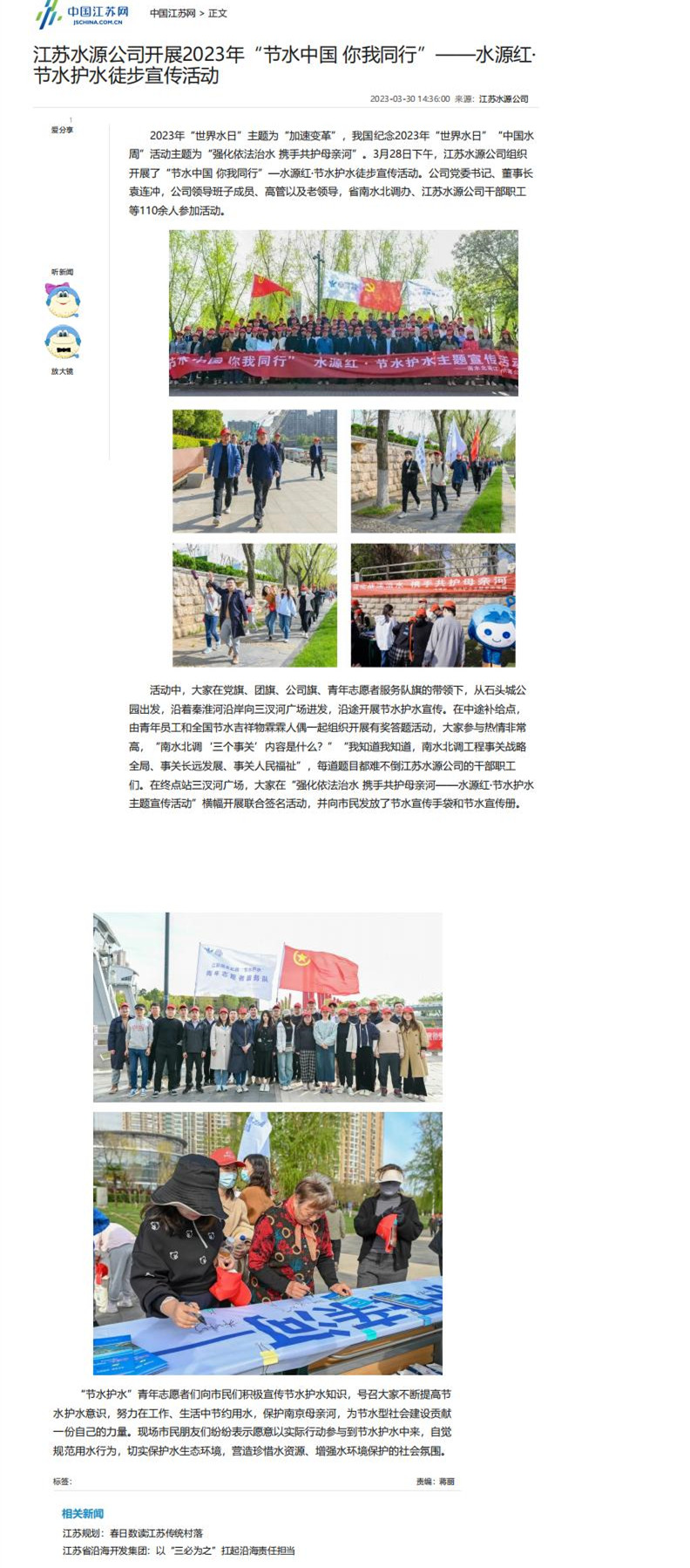 中国江苏网、新江苏网:黑料 开展2023年“节水中国 你我同行”——水源红·节水护水徒步宣传活动
