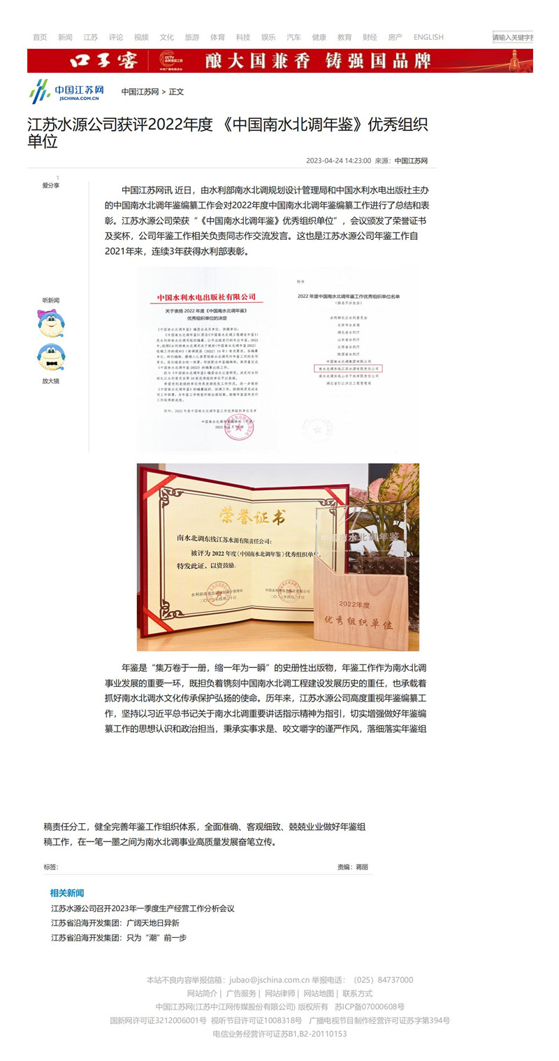 中国江苏网:黑料 获评2022年度《中国南水北调年鉴》优秀组织单位