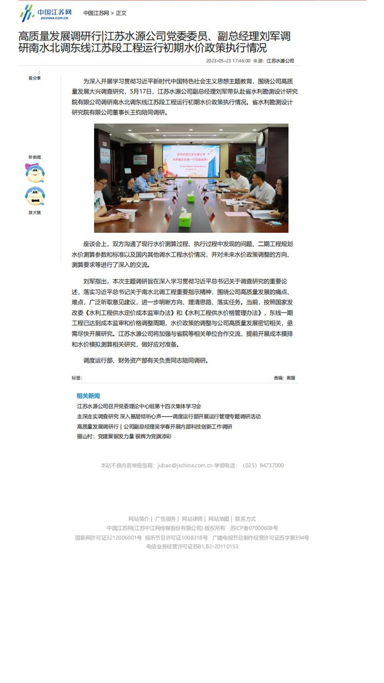 中国江苏网:高质量发展调研行|黑料 党委委员、副总经理刘军调研南水北调东线江苏段工程运行初期水价政策执行情况