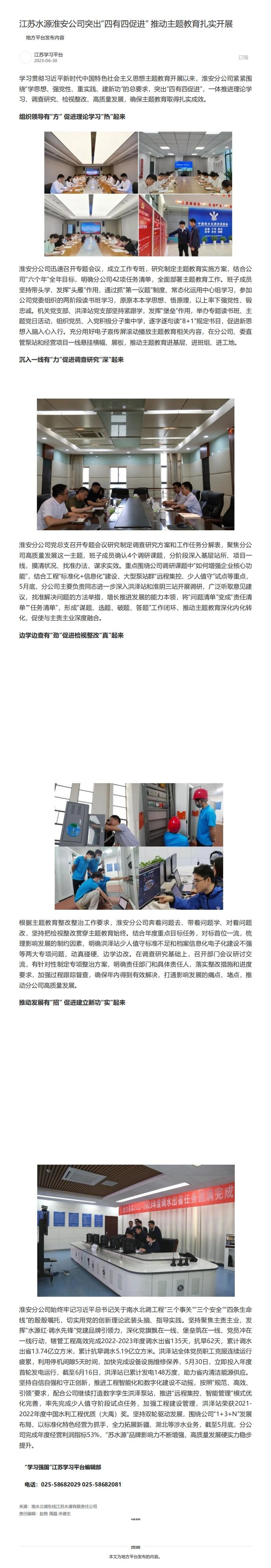 主题教育官网、学习强国、中国江苏网:江苏水源淮安公司突出“四有四促进” 推动主题教育扎实开展