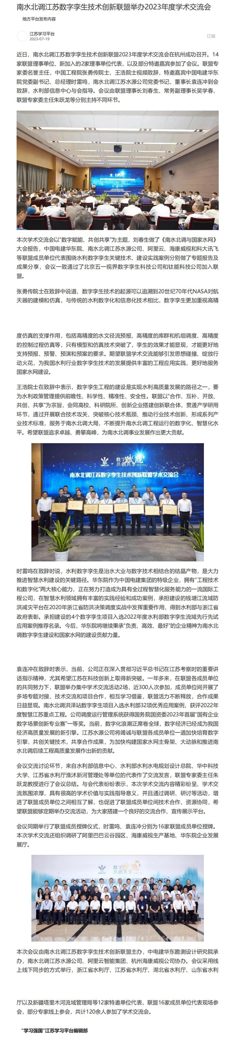 学习强国、中国江苏网、新江苏网:南水北调江苏数字孪生技术创新联盟举办2023年度学术交流会