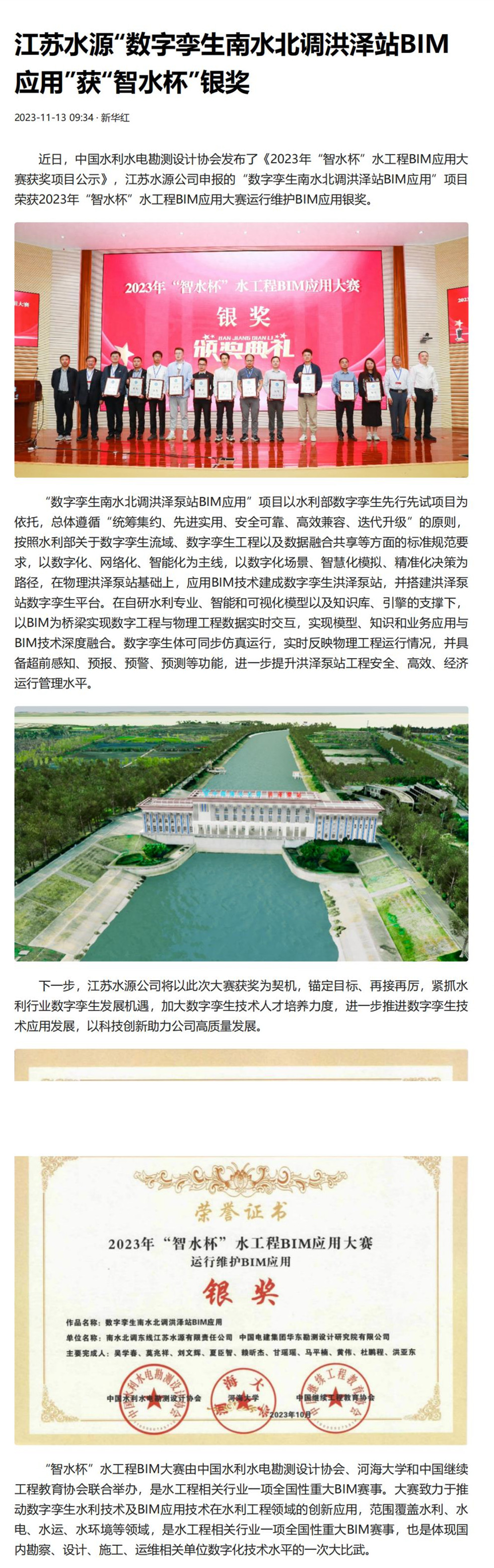今日头条——江苏水源“数字孪生南水北调洪泽站BIM应用”获“智水杯”银奖
