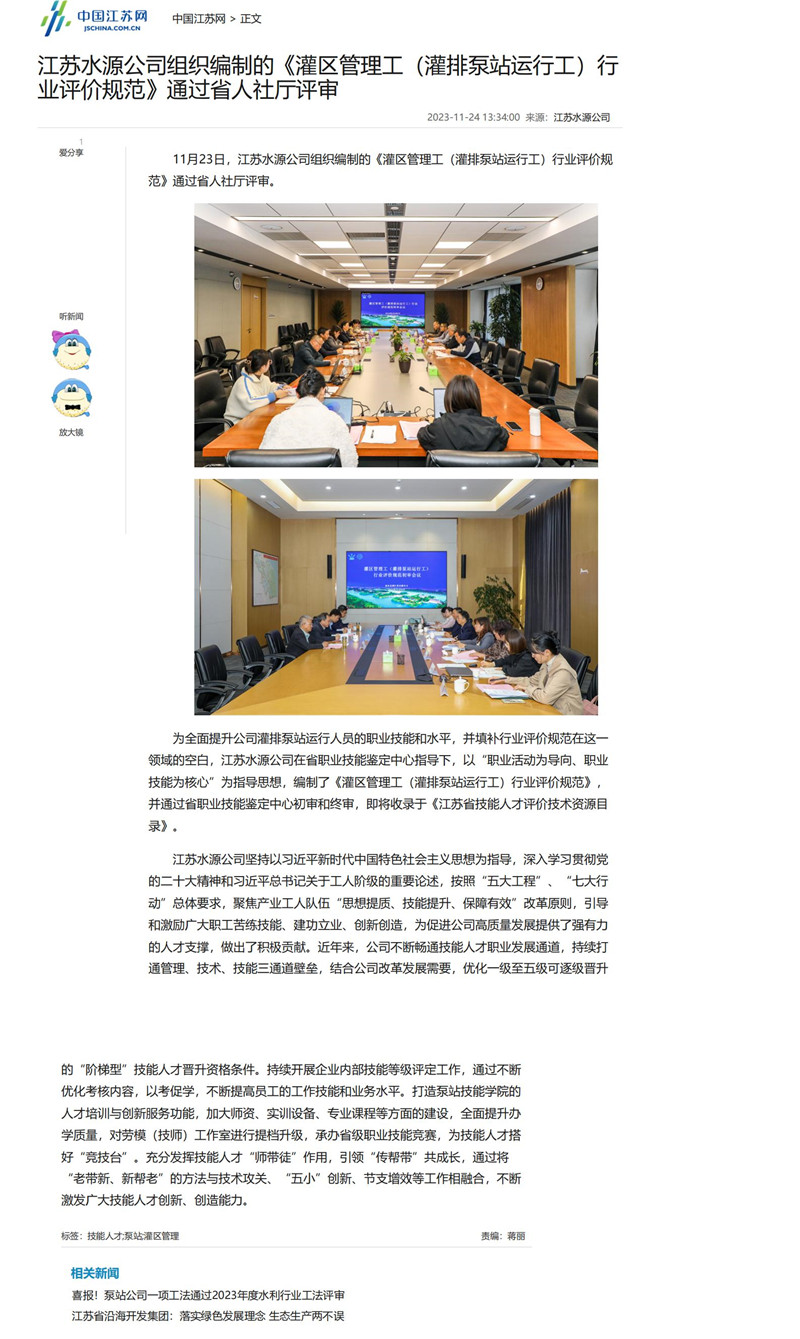 中国江苏网——黑料 组织编制的《灌区管理工(灌排泵站运行工)行业评价规范》通过省人社厅评审