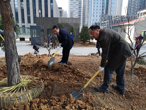 总经理荣迎春与公司领导濮学年、李松柏、徐向红,率公司员工大楼周边预留空地上开展植树活动。