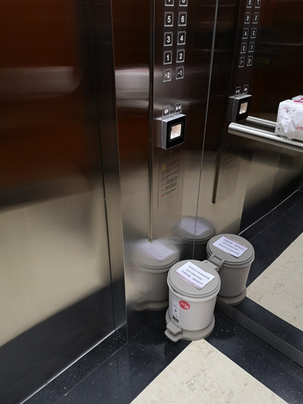 电梯内外悬挂纸巾盒,配备专用垃圾桶