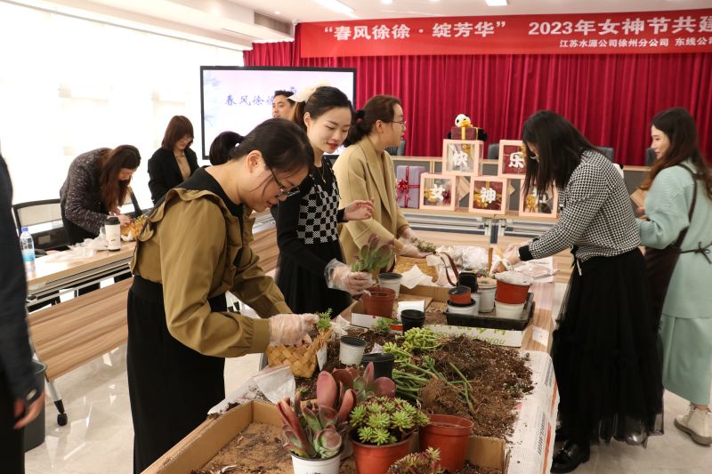 阳春三月,草长鸢飞,第113个三八国际妇女节如期而至。为进一步提升职工团队凝聚力,激励女职工弘扬立足岗位、巾帼不让须眉的精神,3月8日,徐州分公司邀请南水北调集团东线有限公司徐州分公司,共同开展“春风徐徐•绽芳华”多肉艺术DIY活动。两家分公司班子成员与十余名女职工共同参加活动。