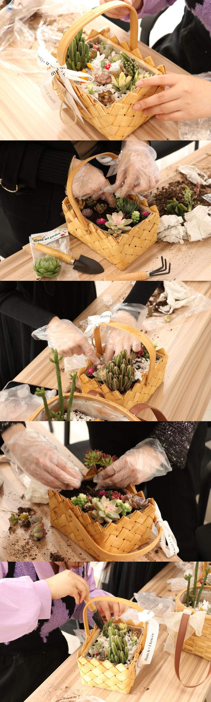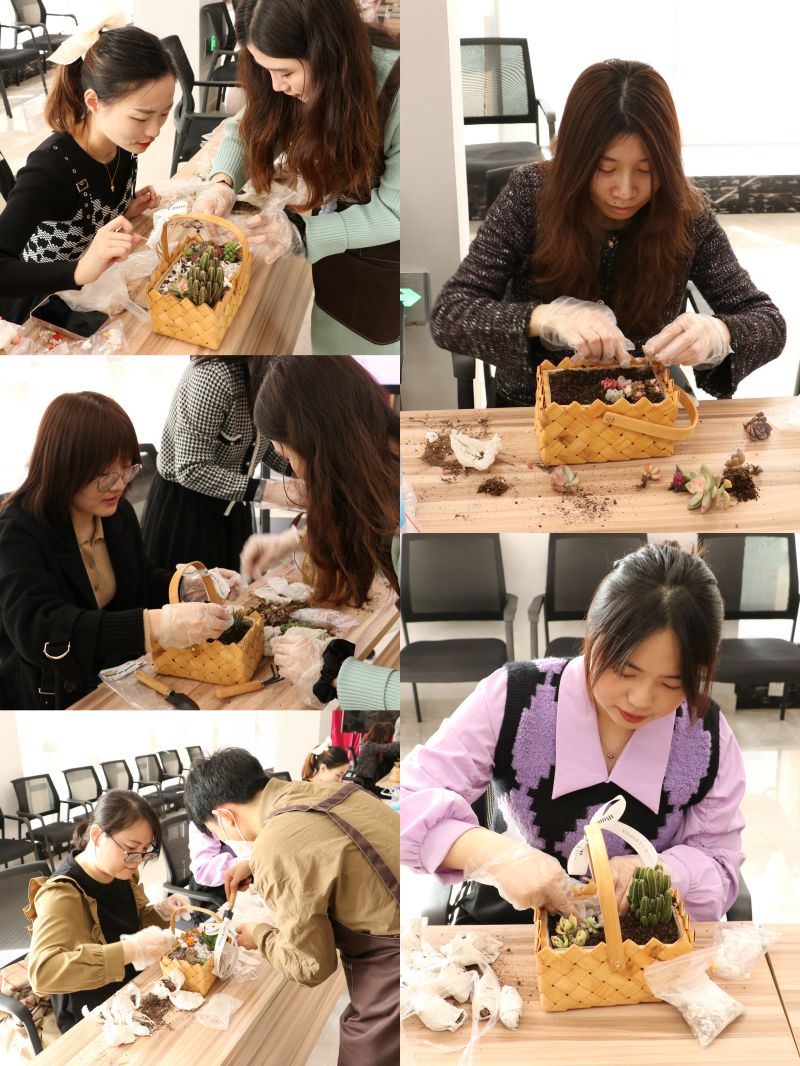 活动现场,专业园艺老师向大家介绍了多肉植物的形态特征、主要品种、生长特点以及多肉的日常养护方法,并示范了正确的栽种多肉绿植的方法,女职工们认真倾听、仔细观察。DIY环节,女职工们变身巧手花匠,按照个人喜好、植物特性以及色彩搭配合理选择花材,填土栽植,展示出了丰富的创造力。活动结束后,大家将本次DIY的多肉花篮分送两家公司各部门,使全体职工在三月里感受到了春意萌动的快乐。